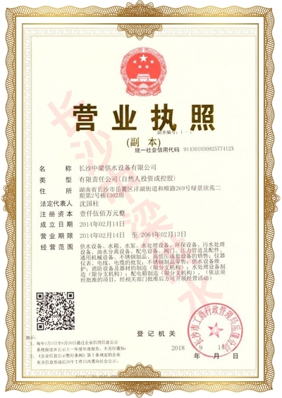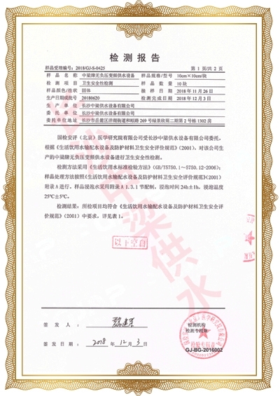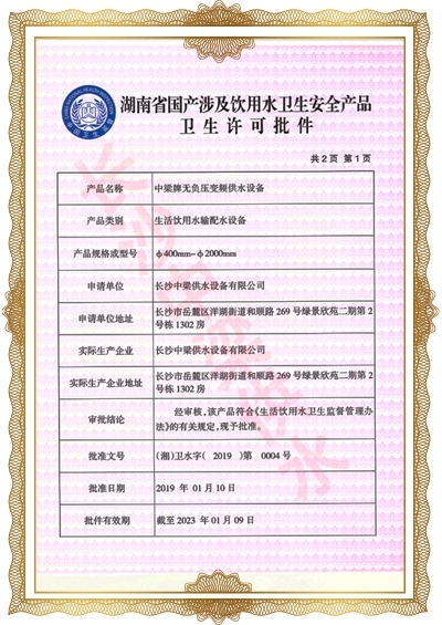 長沙中梁供水設(shè)備有限公司已先后通過湖南省衛(wèi)生廳國產(chǎn)涉及飲用水衛(wèi)生產(chǎn)品衛(wèi)生許可批準;